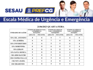 Confira a escala médica de plantão nas UPAs e CRSs nesta quarta-feira, dia 21 de junho de 2023.