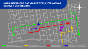 Na quinta-feira (7), a partir das 5h, a Rua 13 de Maio onde ocorre o desfile, será totalmente interditada, entre as avenidas Mato Grosso e Fernando Corrêa da Costa, assim como a Rua 14 de Julho, entre a Avenida Fernando Corrêa da Costa e a Eça de Queirós. A previsão é de que as vias sejam liberadas, após o desfile de 7 de setembro, a partir das 13h.