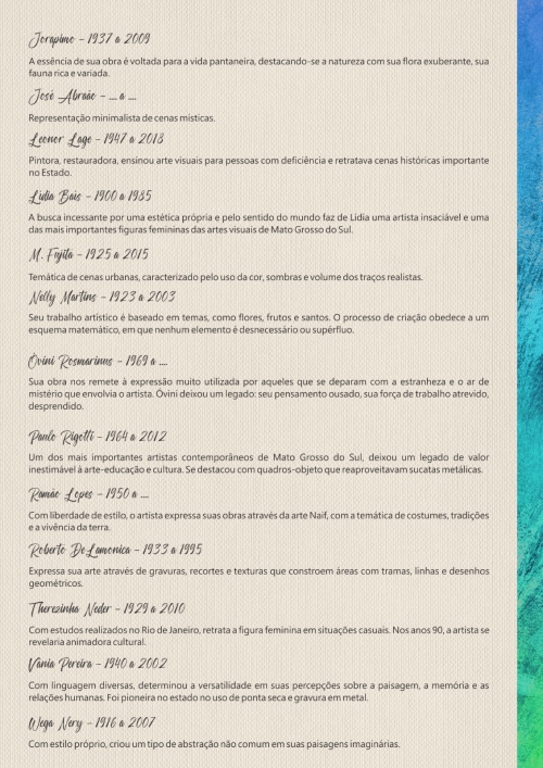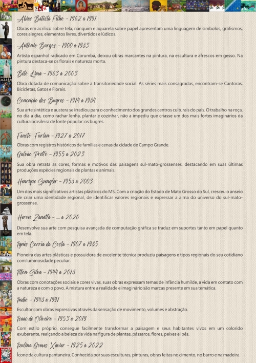 Na inauguração, um vernissage vai homenagear 26 artistas sul-mato-grossenses “in memoriam”, e a apresentação cultural da noite vai ficar por conta da atriz e jornalista Bianca Ramoneda e do músico Leandro Perez, com a apresentação do sarau “Voar Fora da Asa” – uma leitura da obra de Manoel de Barros. Com voz e violão, eles vão interpretar canções consagradas do genuíno repertório de Mato Grosso do Sul.